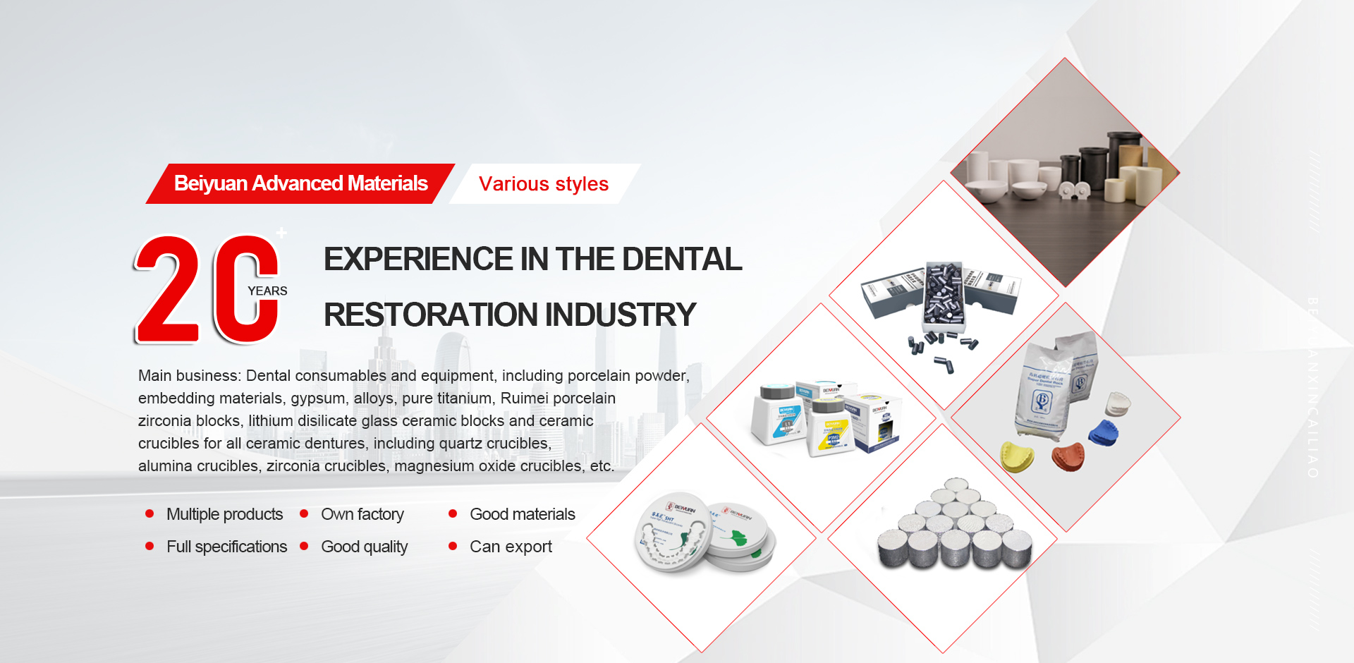 Luoyang Beiyuan Advanced Materials Technology Co.,Ltd is located on Weisi Road in Yichuan Industrial Agglomeration Zone. It was founded in 1996 in Luoyang High tech Zone and settled in Yichuan Industrial Agglomeration Zone in 2017. The company currently specializes in dental porcelain powder, zirconia blocks, investment Materials , gypsum, dental alloys, dental casting crucibles and other oral restoration materials, as well as crucibles widely used in glass glaze diamond tools and precious metal melting. It is a high market share and comprehensive manufacturing enterprise in China, providing complete solutions for more than 90% of denture processing enterprises.